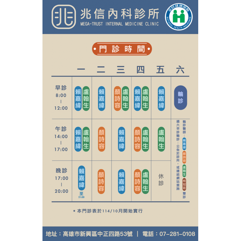 自114年10月1日起,本院門診表將些微調整 目前本院仍由 賴嘉緯醫師、顏詩容醫師、盧翰生醫師 持續擔任全職主治醫師, 柯冠廷醫師 維持於週六早診隔週看診,讓看診更順暢! 四位醫師皆為 內分泌新陳代謝科專科醫師,搭配...